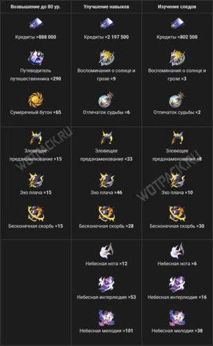 Wichtige Materialien wie 56 Schriftstücke an der Wand, 71 Echos des Weinens und 73 Endlose Trauer, die für das Aufleveln und die Erweiterung der Fähigkeiten von Keridra erforderlich sind.