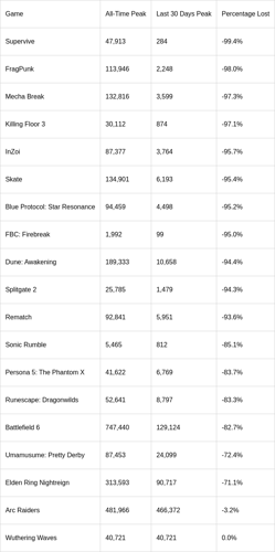 Using data sourced from SteamDB, it was observed that nearly half of these titles—11 in total—have seen their player counts decline by over 90 percent since their peak. These include notable names such as Supervive, Fragpunk, Mecha Break, Killing Floor 3, Inzoi, Blue Protocol: Star Resonance, FBC: Firebreak, Dune: Awakening, Splitgate 2, Rematch, and Skate.